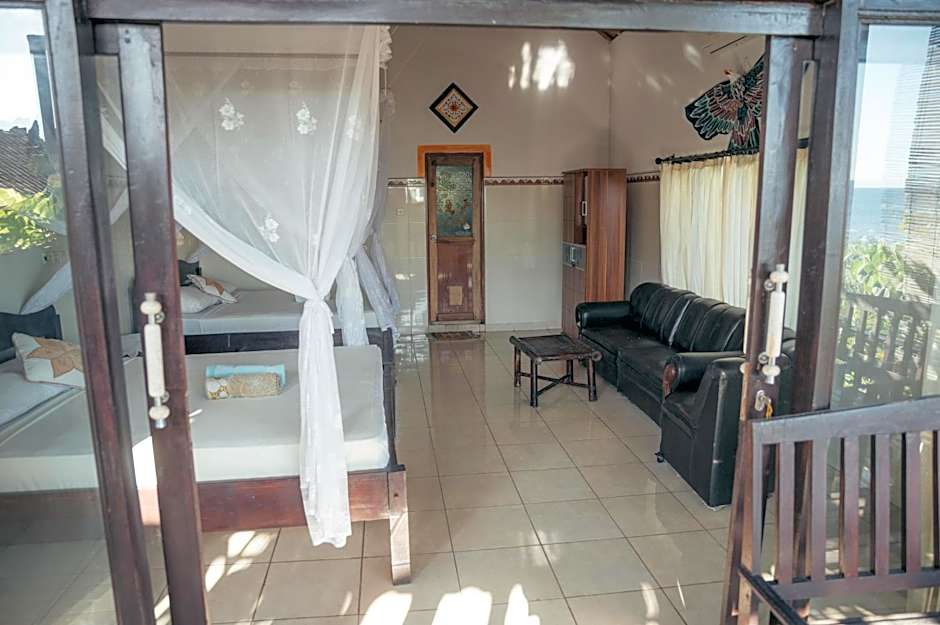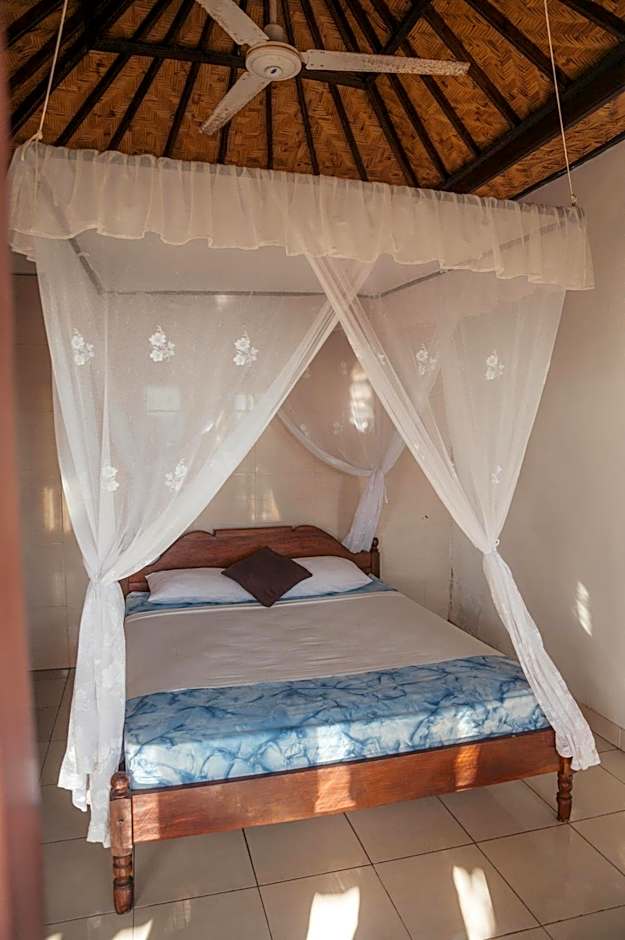 Basic room with a fan and mosquito net featuring a terrace with garden and sea views. It offers an private bathroom with free toiletries and hot water facilities.